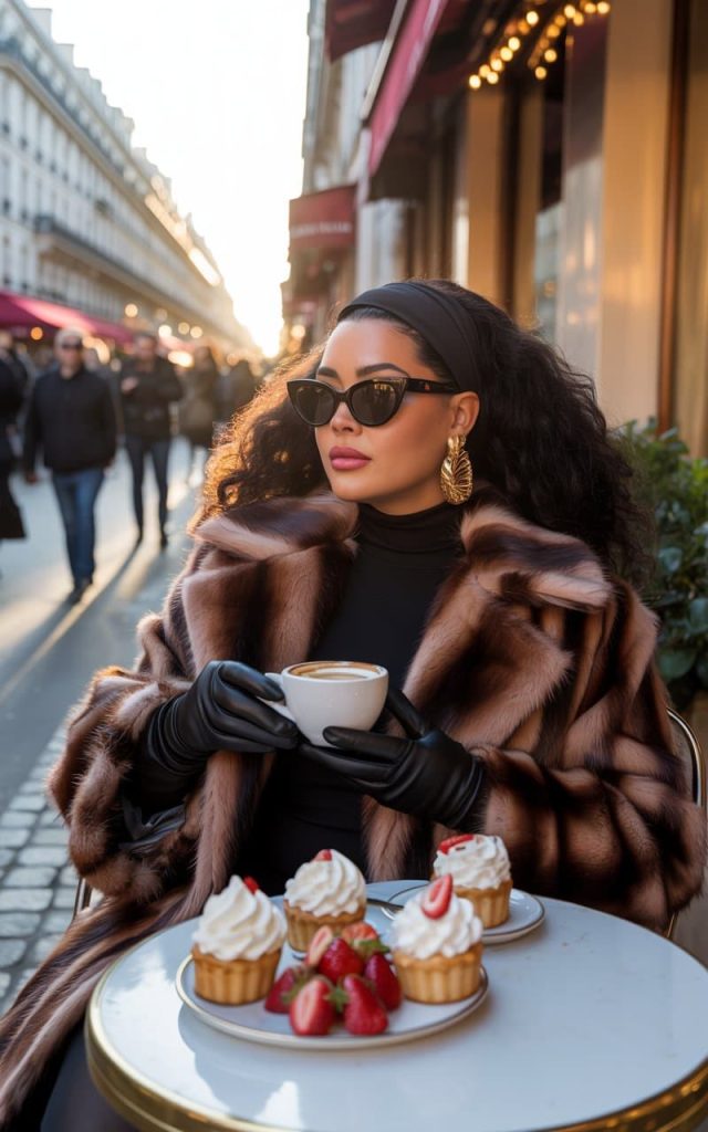 Style tip: Go for a faux fur in warm brown tones—they photograph beautifully and complement every skin tone. If you’re plus-size, make sure the coat hits mid-thigh for that perfect proportion play—it defines your shape without adding bulk. Pull your hair back with a wide black headband to balance all the texture, and opt for bold matte lipstick to pop against the neutrals. Bonus: sipping coffee slowly while pretending not to notice everyone staring is the real Parisian accessory. ☕💋