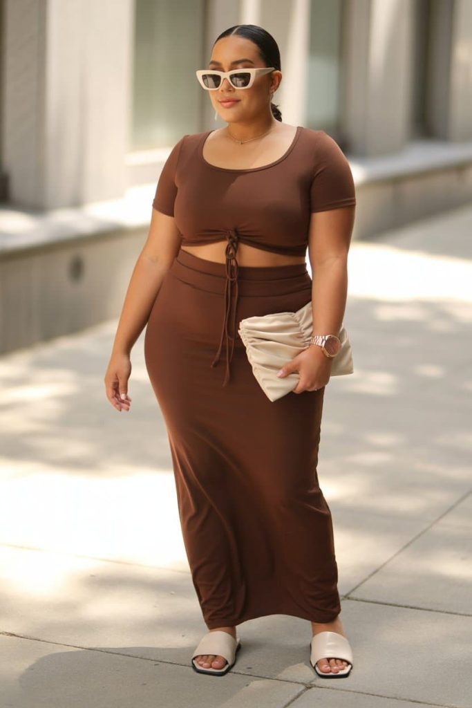 Style tip: keep accessories light and creamy (neutral slides, soft clutch, gold jewelry) so the rich brown does all the talking, and slick hair or a low bun seals the polished vibe.
