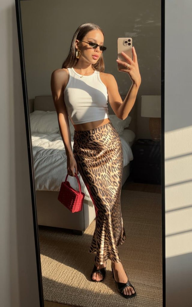 The clean white crop keeps it effortless, while the silky leopard skirt brings all the drama—sleek, slinky, and very “don’t underestimate me.”