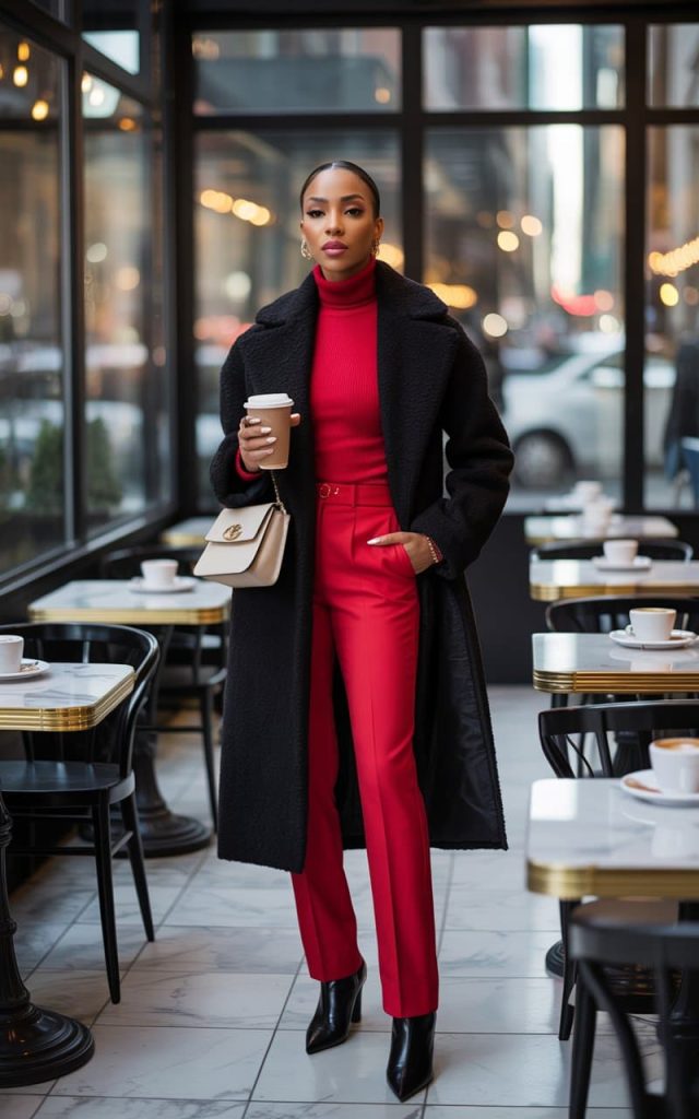 This look said “I came for coffee but stayed to slay.” The bold red-on-red combo is pure power dressing—like Valentine’s Day met Wall Street and said, “Let’s make it fashion.” The black coat adds that quiet confidence layer, the kind that whispers CEO energy, while those pointed boots are practically weapons of style destruction. The beige bag? A soft reminder that she’s balanced—she’ll close a deal, then sip her latte unbothered. Styling tip: when you’re going monochrome in a statement color, keep your outerwear and accessories neutral so you stay bold, not blinding. This outfit is serving rich, radiant, and ready to conquer before her cappuccino even cools.