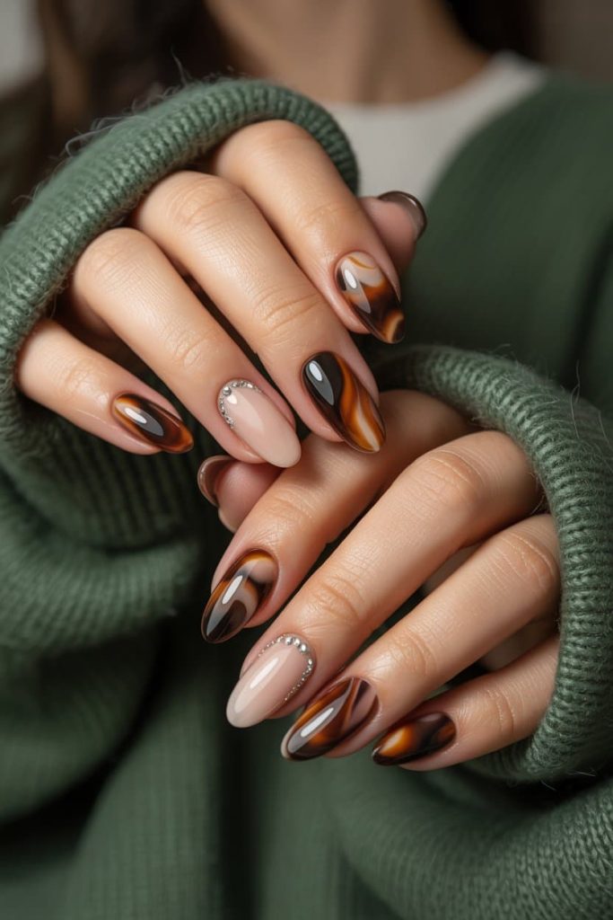 Tell me why these nails look like rich girl autumn just filed them into existence. The tortoiseshell is giving vintage-designer-sunglasses energy — that glossy mix of caramel, espresso, and molten chocolate that screams “I only drink $8 lattes and I deserve every sip.” And the nude nails with the tiny silver studs? That’s the quiet-luxury sister who minds her business and still steals every compliment in the room. If you want to recreate this vibe, go for gel shades like espresso brown, warm caramel amber, black coffee marble, milky nude beige, and a sheer glossy top coat that looks wet even when it’s dry. Add a few tiny chrome silver studs and boom — your hands look like you just signed a trust fund.