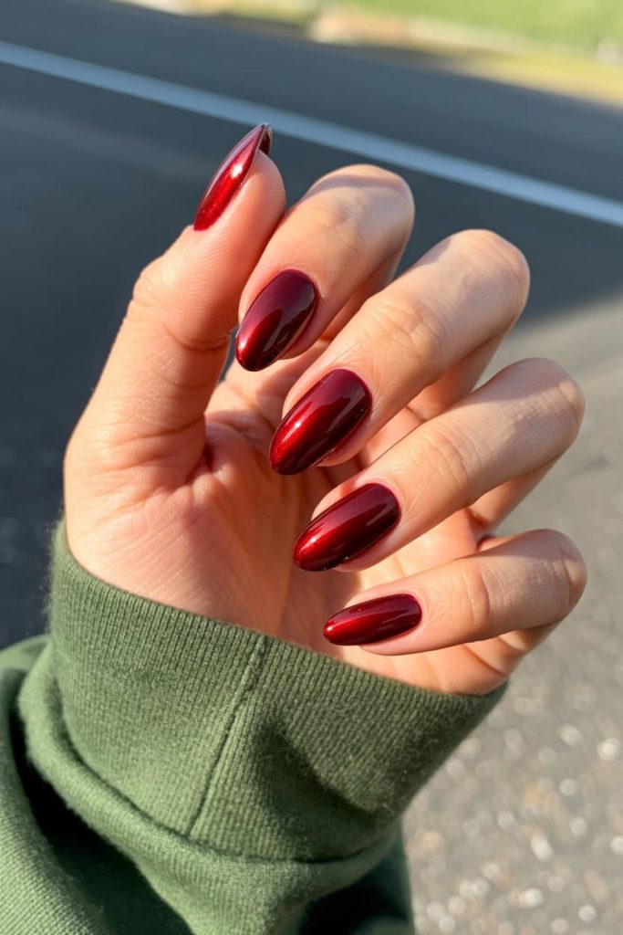 hese nails are screaming “main character in a Christmas romance, but make it dangerous.” That red chrome is so reflective it looks like you dipped your fingertips into liquid rubies — the kind of shade that convinces strangers you drive a blacked-out G-Wagon and only date men who wear cashmere. The almond shape? Flawless. The shine? Illegal. If you want this exact molten-red moment, reach for colors like OPI “I’m Not Really a Waitress,” DND “Cherry Chrome,” OPI “Mme. President,” or ILNP “Cherry Luxe.” Finish it off with a mirror-chrome powder or a glass-shine gel top coat, and boom — your nails become the most festive, flirt-coded accessory you own.