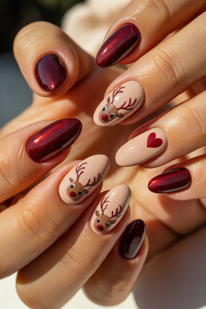 These nails said “I am the holiday spirit AND the cutest ornament on the tree.” The deep red sparkle is giving rich-velvet Santa suit energy — the kind of shade that makes you randomly wave your hand around just to catch the light. And the nude nails with the tiny Rudolph faces? BABE. That’s peak cozy-cute. The glossy beige base makes the red heart pop like a little love note, and the reindeer art is so adorable it could get you out of a parking ticket. If you want to recreate this vibe, grab a nude gel like OPI “Samoan Sand” or The GelBottle “Nude Beige,” pair it with a rich glitter red such as DND “Queen Red,” ILNP “Say Love,” or OPI “Toying With Trouble.” Add a glossy top coat, micro-detail brushes, and a tiny dotting tool for that perfect Rudolph red nose — and boom, you’re officially the cutest thing in December.