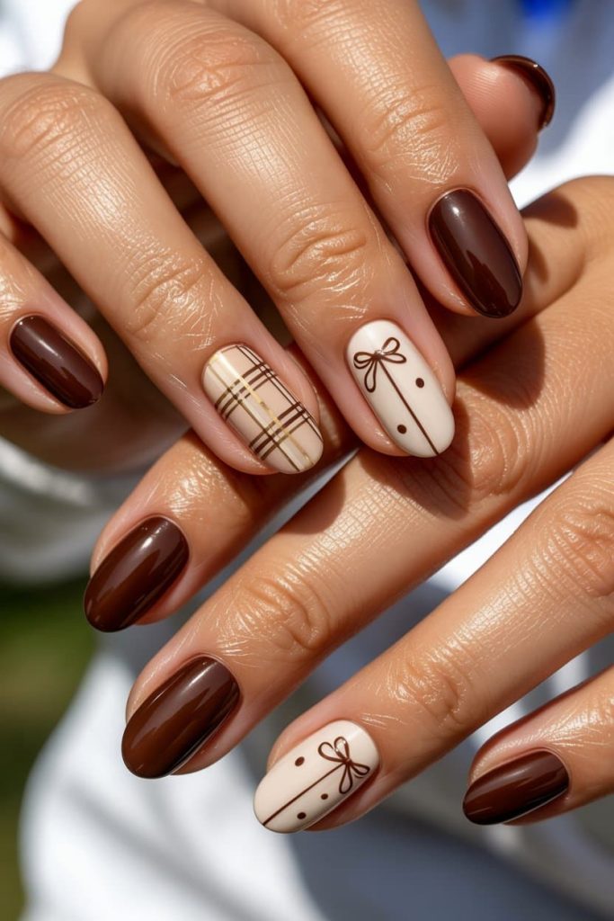 The deep glossy brown looks like melted Ghirardelli on your fingertips — rich, silky, and absolutely not for girls who settle for basic winter vibes. Then those creamy almond nails with the tiny bow art? BABE. That’s soft-girl elegance with a “yes, I bake but only in a cashmere sweater” energy. And the plaid? That’s holiday-latte aesthetic wrapped in a manicure. If you want to recreate this exact warm-neutral masterpiece, grab a chocolate gel like DND “Chocolate Milk,” OPI “Brown to Earth,” or The GelBottle “Café Au Lait.” For the cream base, go with OPI “Pale to the Chief” or DND “Snowflake.” Add gold striping tape or gel liner for the plaid, plus a fine brown liner gel for the bows — and finish with a glass-shine top coat so your nails look like a luxury coffee commercial every time you move your hands.