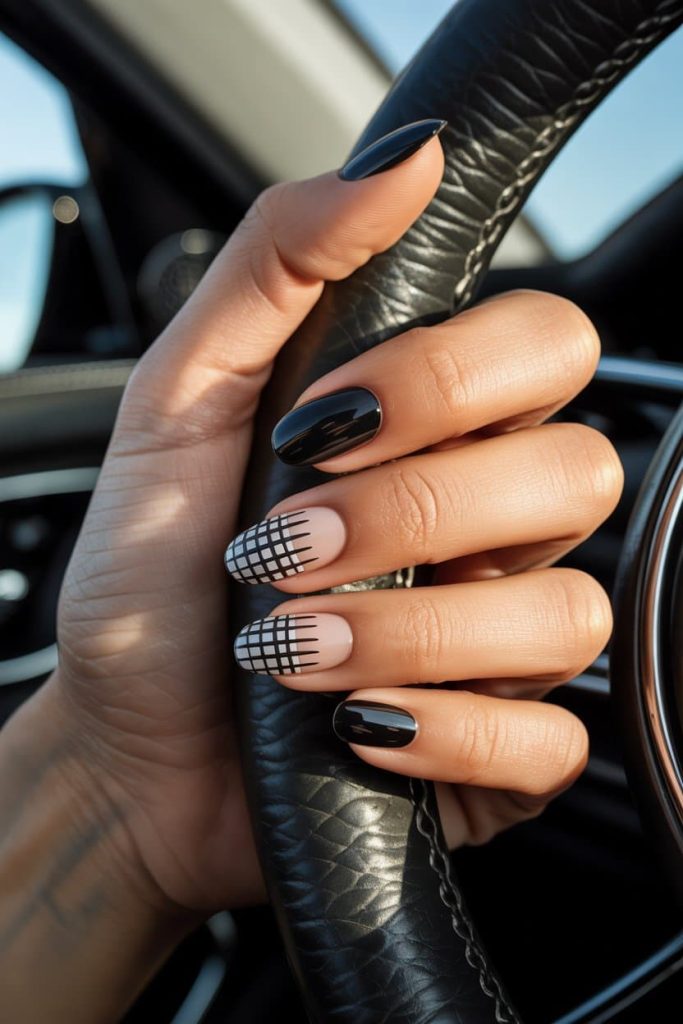 The glossy black is so shiny it looks like literal obsidian — clean, sharp, and dramatic enough to make every outfit suddenly feel editorial. Then those nude accent nails with the black grid lines? BABE. That’s minimalist architecture-chic. That’s “I only wear structured coats and listen to podcasts about money.” The contrast is crisp, expensive, and straight-up boss behavior. If you want this exact vibe, grab a jet-black gel like OPI “Black Onyx,” DND “Black Licorice,” or The GelBottle “Jet Black.” For the nude base, go with OPI “Bubble Bath” or DND “Silky White Beige.” Use a thin liner brush and black gel liner for those precise grid lines, and seal it all with a glass-shine top coat so every time you grab the steering wheel, you look like you’re starring in your own luxury car commercial.