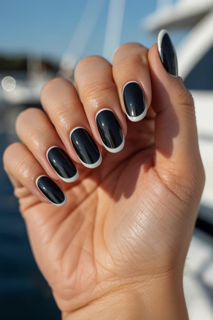The glossy black center is so reflective it looks like a pair of designer sunglasses, and that crisp white outline? BABE. That’s not a manicure — that’s graphic design. Clean, sharp, expensive. The kind of nails that make you order a $22 spritz just because your hand looks too good not to hold a glass. If you want this exact rich-aesthetic vibe, start with a jet-black polish like OPI “Black Onyx,” DND “Black Licorice,” or The GelBottle “Jet Black.” For the outline, use a bright white like OPI “Alpine Snow” or DND “French White.” Apply the white with a thin liner brush to get that perfect oval frame, then seal everything with a glass-shine gel top coat so your nails reflect light like you’re permanently on a yacht.