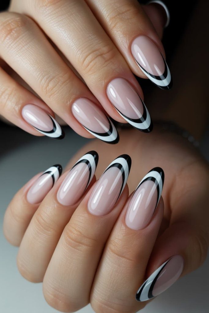These nails are giving “CEO of the Clean Girl Aesthetic… but make it dangerously chic.” The sheer blush base is soft, glossy, and innocent, but that sharp triple-curve French tip in black and white? Baby, that’s where the plot twist hits. It’s elegant, graphic, and just bold enough to make people think you have very expensive taste and even more expensive enemies. The contrast is so crisp it looks photoshopped — the kind of manicure you pair with a structured blazer, a quiet-luxury handbag, and an attitude.