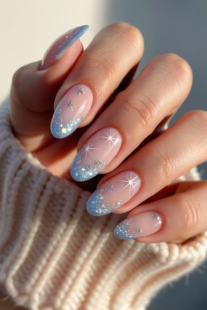 This season is all about embracing textures, layering finishes, and playing with those dreamy tones that only winter light can make look that good. From soft pink milky bases to frozen glitter tips, hand-painted stars, metallic accents, and holographic bursts—your nails can literally become the prettiest accessory you wear all season. Even your favorite sweater can’t compete.
