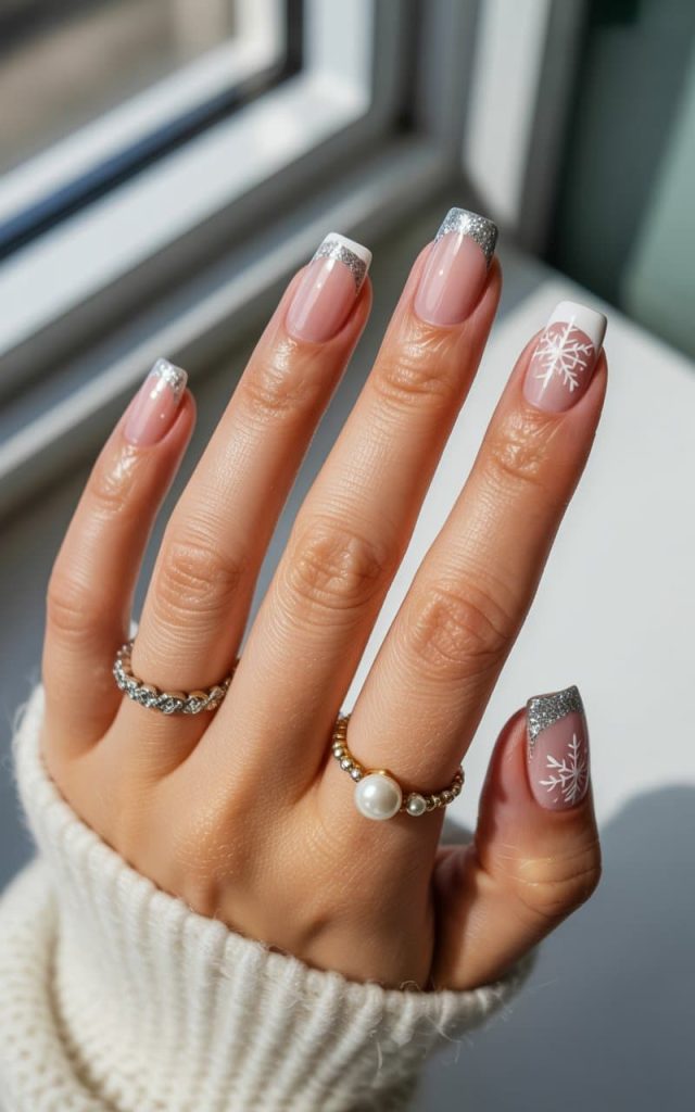 These nails are giving “I came to slay winter, not survive it.” The silver-glitter French tips? Chic. The crisp white snowflakes? Iconic. The glossy nude base? Pure rich-auntie energy. This is the kind of manicure that makes you pull your sleeves up on purpose, sip your latte slower, and tap your phone just a little louder so everyone gets the full show. Honestly, if your nails look like this, you’re not just ready for winter — winter is lucky to have you.