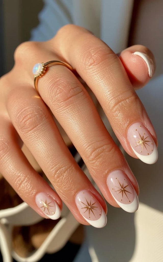 The clean white French tips? Classic. The gold starbursts? Astronomical. This is the manicure of a woman who casually says, “Manifesting abundance,” then actually gets it. The kind of nails that sparkle in the sunlight and suddenly you’re like, “Wait… am I the angel Gabriel?” No, babe — you’re just that gorgeous. These nails don’t just complete an outfit, they elevate your entire aura. Honestly, if elegance and a glow-up had a baby, it would be this manicure.