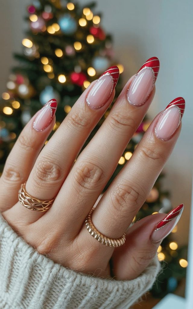 These nails said “holiday spirit?” No babe — I am the holiday spirit. The red candy-swirl tips are giving peppermint-princess-meets-rich-auntie energy, while that silver detailing is sparkling harder than your ex’s excuses. The almond shape? Sharp enough to unwrap gifts, slice through drama, and point directly at whoever needs to fix their attitude. Paired with the gold rings and cozy sweater, this whole look screams “I bake cookies, drink cocoa, and still look like a walking Pinterest board.” Basically, if Christmas had a manicure… it would be this.